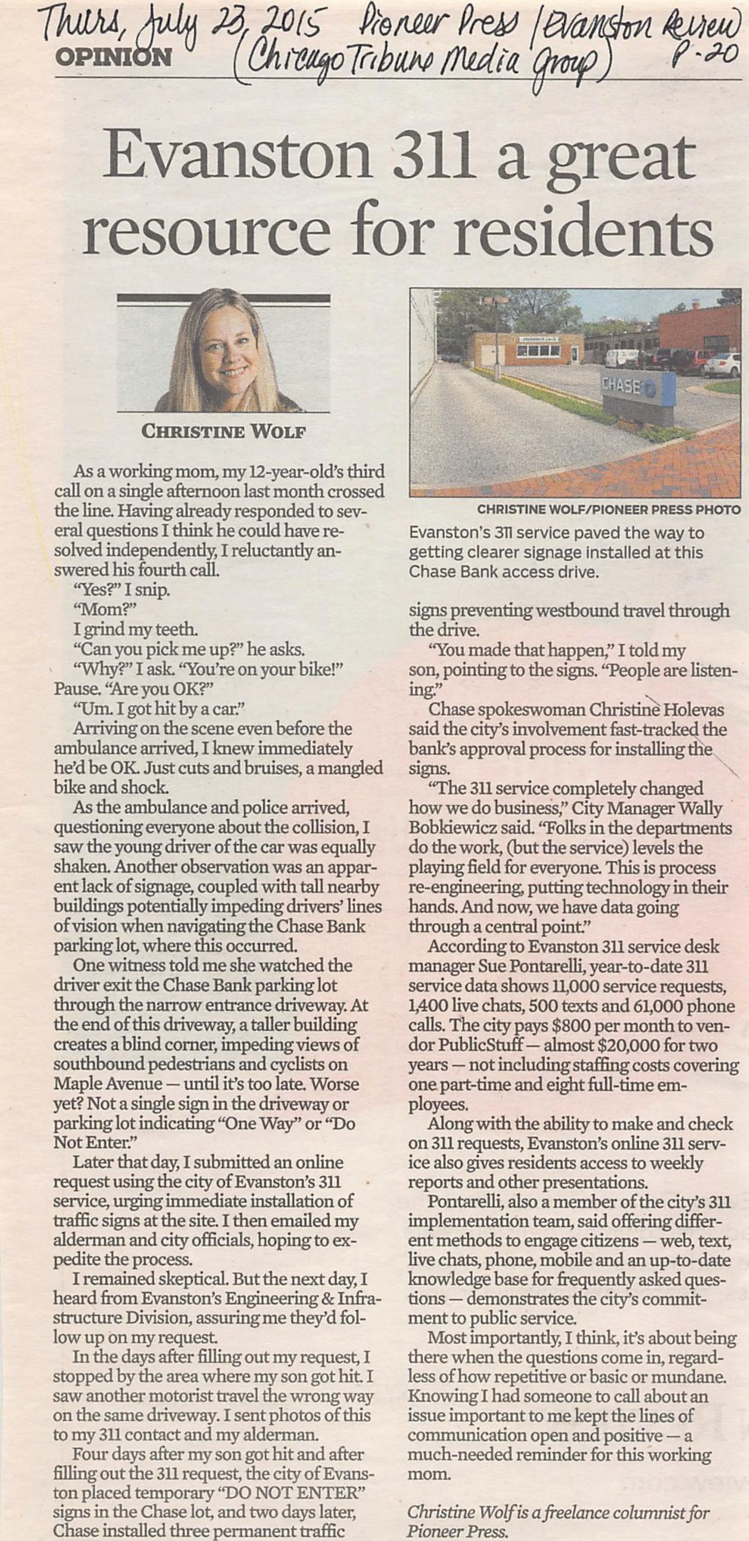 Evanston 311 a Great Resource for Evanston by Christine Wolf, Chicago Tribune, 7/23/15. Shared with permission. Copyright Chicago Tribune LLC