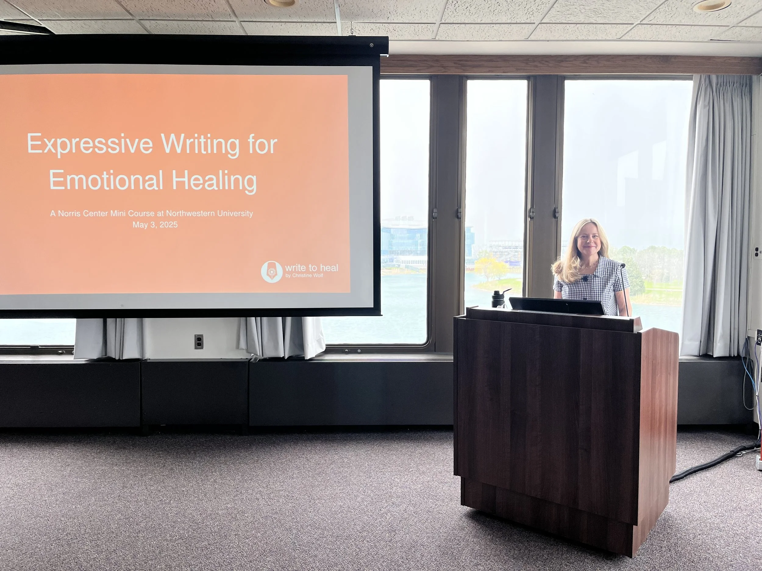 Author and memoir coach teaching Expressive Writing for Emotional Healing at Northwestern University, May 3, 2025 (photo by Eric Ronne)