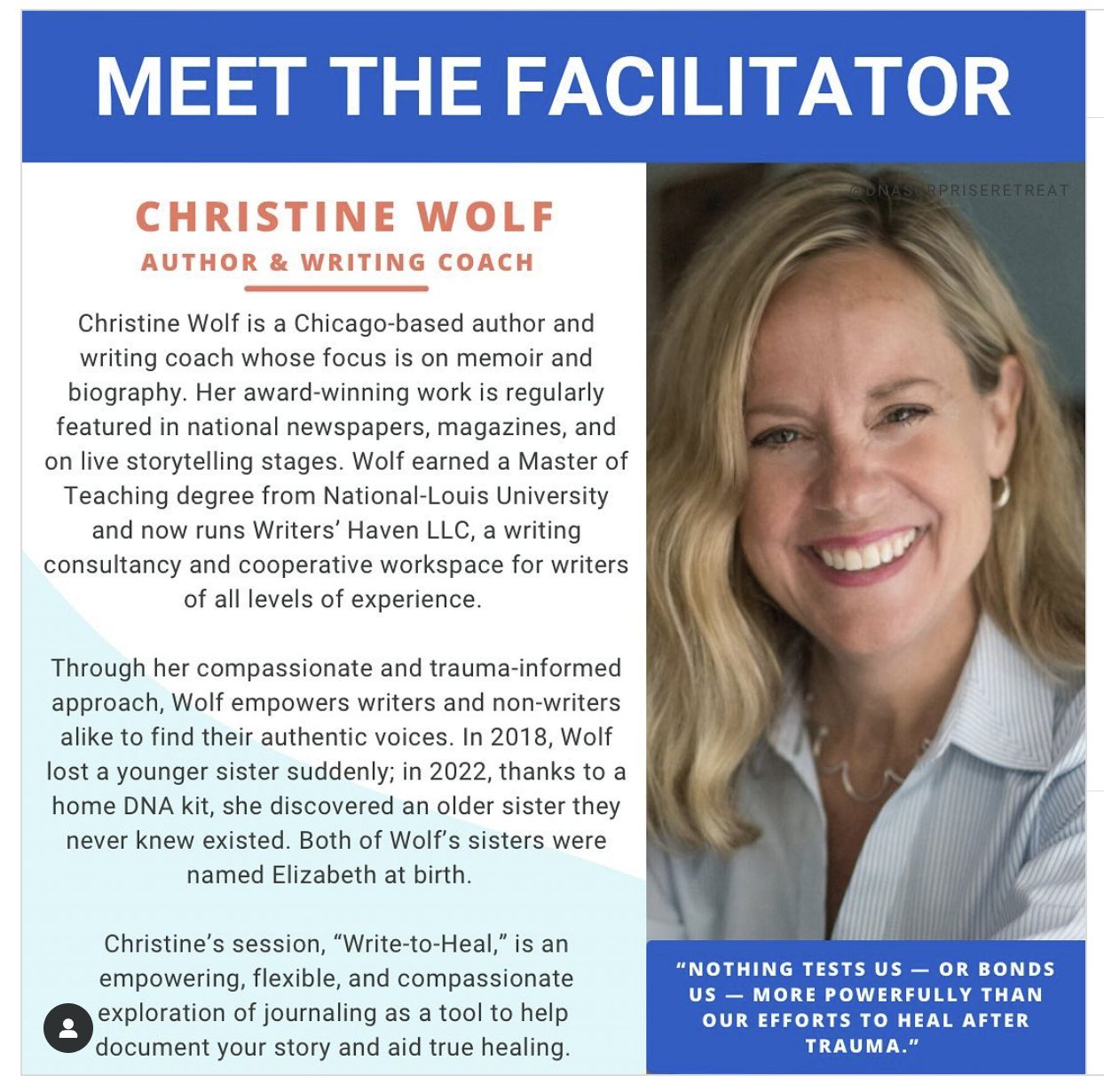 I'm an author, memoir coach, and faculty member at, among other places, Story Jam Studios and The Infinity Foundation. I’ve led workshops and panel discussions at numerous places, most recently at the Association of Writers & Writing Program (AWP) 2024 Conference, The DNA Surprise Retreat, and others.